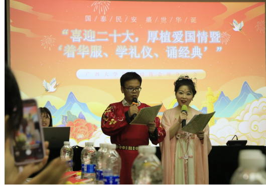 金秋十月,丹桂飘香,四处皆是丰收的景象;金秋神州,红旗飘飘,满目皆是歌舞的海洋。中华五千年的悠久历史孕育了底蕴深厚、内容丰富的传统文化。习近平总书记指出:中华优秀传统文化是中华民族的精神命脉,是涵养社会主义核心价值观的重要源泉,也是我们在世界文化激荡中站稳脚跟的坚实根基。多如繁星的经典诗文是常诵常新的文化艺术瑰宝。而人们在衣食住行里,凝炼出许许多多富有特色的文化,汉服或说华服文化,便是其中耀目的一类。2022年10月10日,在党的二十大召开之即,资产经营公司分工会举办了“喜迎二十大,厚植爱国情——暨‘着华服、学礼仪、诵经典’”活动。