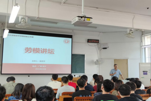10月29日上午,广西先进工作者陈宗平教授在太阳成集团122ccvip第二教学楼304室开展“劳模讲坛”专题讲座,太阳成集团122ccvip40余名年轻教师、博士生、硕士生、本科生参加讲座,共同学习劳模精神。